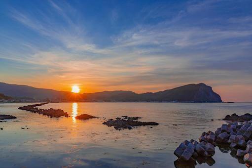 白岩町の海辺に並んで立っているえびす岩と大黒岩。そういえば形が七福神のえびす様と大国様に似ていますね。夫婦岩(めおといわ)とも呼ばれる、不思議な形の巨岩です。